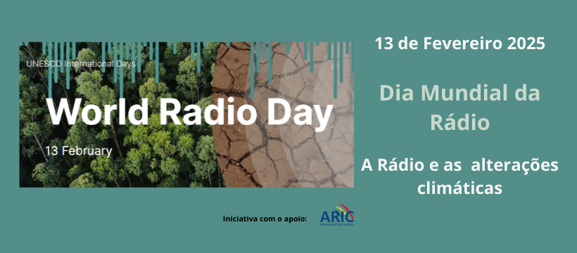 Dia Mundial da Rádio 2025 A Rádio em Imagens Eventos Internacional Notícias Rádio nos media Janeiro 8, 2025 Já foi divulgado o tema orientador para as comemorações do Dia Mundial da Rádio 2025. Neste ano o Dia Mundial da Rádio terá como tema principal “A Rádio e as Alterações Climáticas”. Como sempre a Aric irá proporcionar aos seus Associados um conjunto de recursos para utilização livre, que esperamos venha a ser útil nas suas emissões. O Dia Mundial da Rádio (World Radio Day) assinala-se a 13 de Fevereiro e é uma iniciativa da UNESCO. Mais informação sobre esta iniciativa pode ser encontrada através da seguinte ligação: https://www.unesco.org/en/days/world-radio Share on Facebook Share Share on TwitterTweet Share on Pinterest Share Share on LinkedIn Share Share on Digg Share